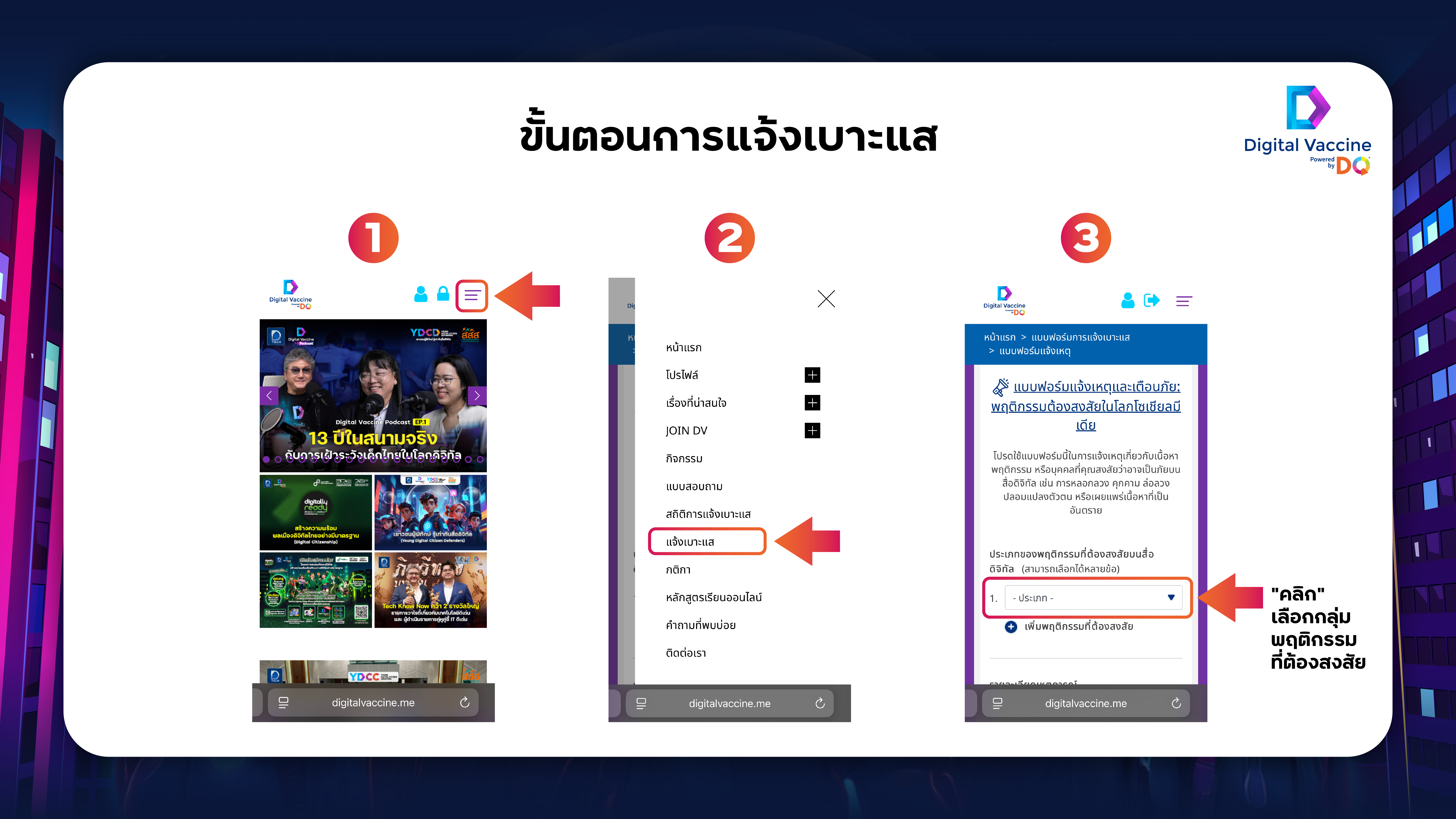 2.ไปที่เมนู “แจ้งเบาะแส” หรือกดตรงนี้ > ฟอร์มแจ้งเบาะแส > https://digitalvaccine.me/report-form.html