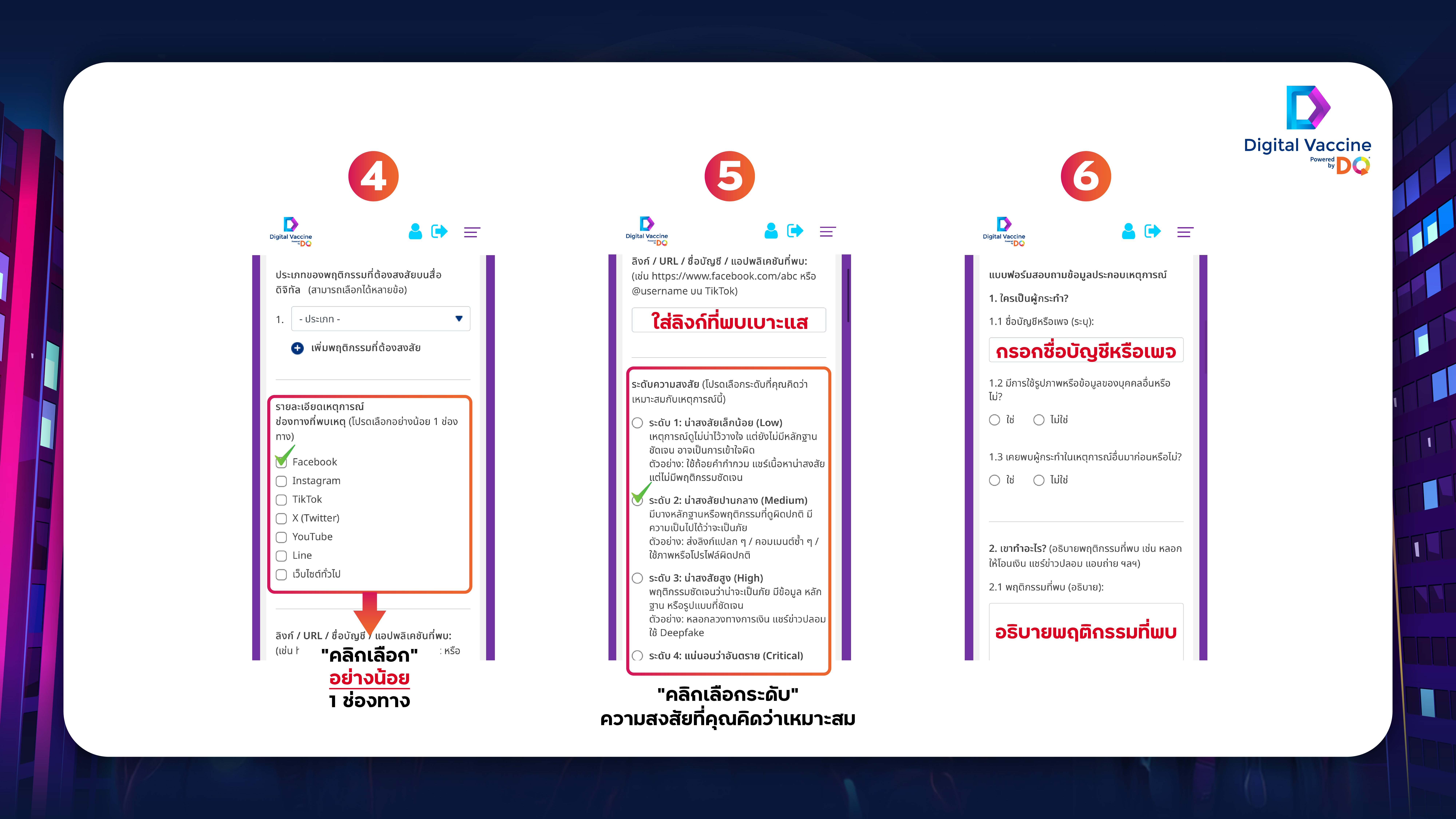 หากไม่แน่ใจ สามารถดูวิธีการใช้งานได้ที่ : ขั้นตอนการแจ้งเบาะแส > https://digitalvaccine.me/article/HowtoReport